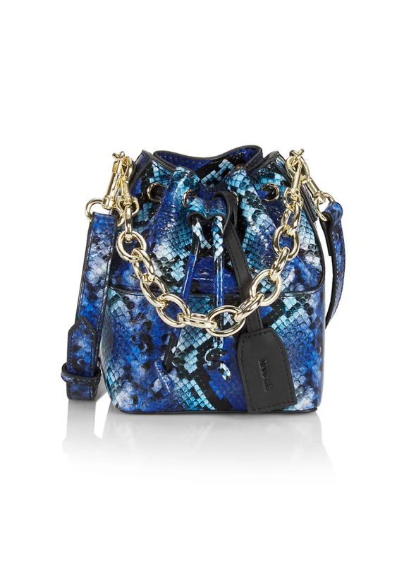 MAX+min Snake Skin Bucket Bag is crafted of genuine leather with a chunky removable chain and leather strap. This micro bags functions as a crossbody + handle bag.