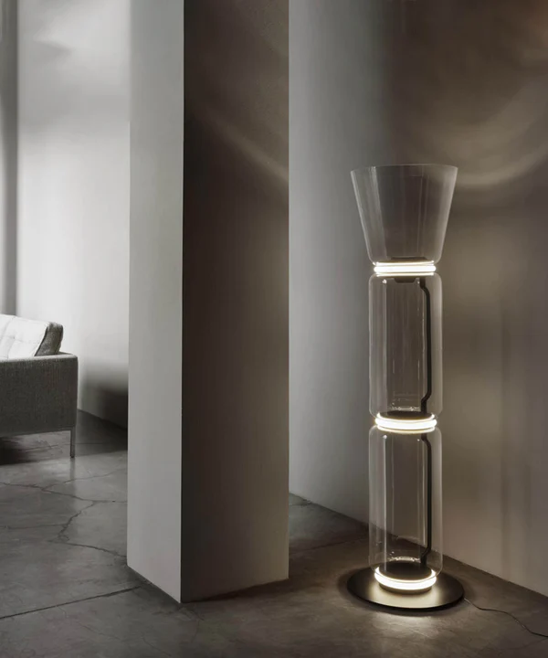 Powered by LED technology Dimmable lamp (controls provided in the power supply unit or power cord) Cylindrical body (transparent hand-blown glass cylinder) available at a low and high height Dome- and cone-shaped head options available for direct lighting Noctambule LED dimmable floor lamp cone top with small base can be used as a pendant light or a standing lamp, depending on how and where you wish to use the fixture. With the option to add more components and units, this lamp is among the most dynamic lighting fixtures offered by FLOS. The innovative lighting system is available in a variety of artful designs and styles. Inspiration behind the design: Inspired by night owls, Noctambule by Konstantin Grcic features a transparent body that almost blends into a room when unlit, but makes its presence known when it illuminates at night.
