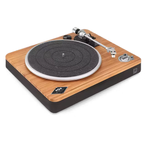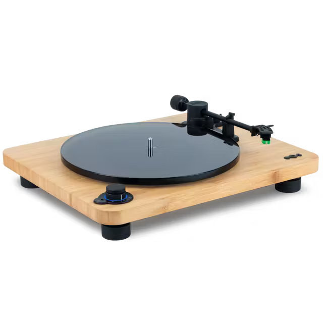 Meet the Stir It Up Lux Bluetooth® Turntable. With a replaceable Audio-Technica 95E elliptical stylus and aluminum headshell, this turntable elevates your experience through improved sound quality and tracking ability. The bamboo plinth and glass platter enhance audio performance, while the double-sided cork slipmat adds playful color. With Bluetooth connectivity, an anti-skate mechanism, adjustable counterbalance, and a built-in pre-amp, theStir It Up Lux Bluetooth® Turntable combines epic sound with sustainability.